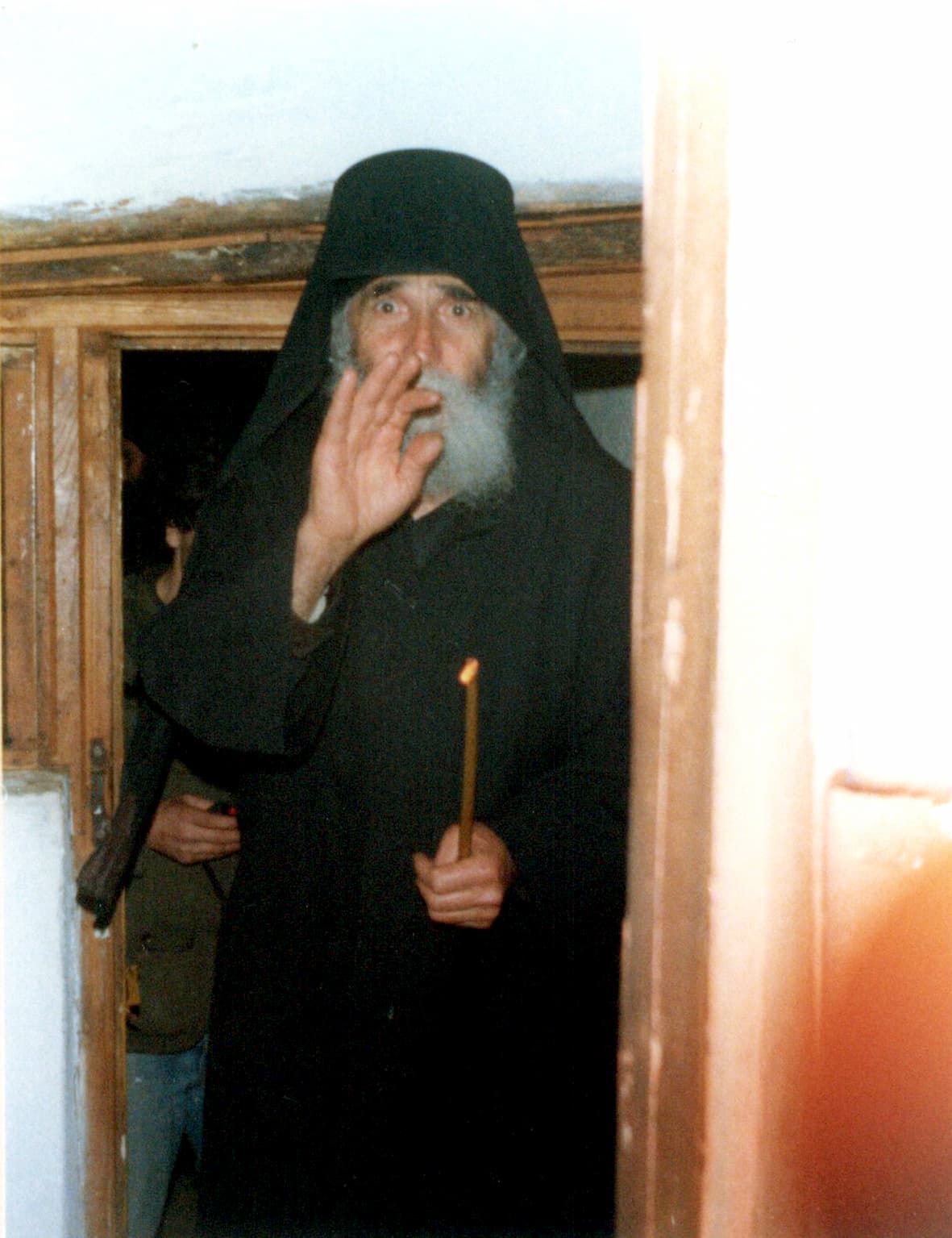 Ἐν καιρῷ ταραχῆς καὶ πολέμου εἰς τὴν Ἑλλάδα, ὁ Ὅσιος, καὶ ὡς ἁπλοῦς πολίτης καὶ ὡς στρατιώτης – ὑπηρετῶν ὡς ἀσυρματιστὴς τὴν στρατιωτικὴν αὐτοῦ θητείαν -, ἐπέδειξεν ἀπαράμιλλον ἀνδρείαν καὶ αὐτοθυσίαν. Πρόθυμος γὰρ ἦτο νὰ δώσῃ ἀνὰ πᾶσαν στιγμὴν καὶ αὐτὴν τὴν ζωήν του ὑπὲρ τῆς σωτηρίας τῶν ἄλλων. Εὑρεθεὶς δὲ πολλάκις ἐν μέσῳ πυρῶν, πολλοὺς διέσωσε διὰ τῶν διαπύρων αὐτοῦ προσευχῶν, ἀλλὰ καὶ αὐτὸς θαυμαστῶς διεσώθη.